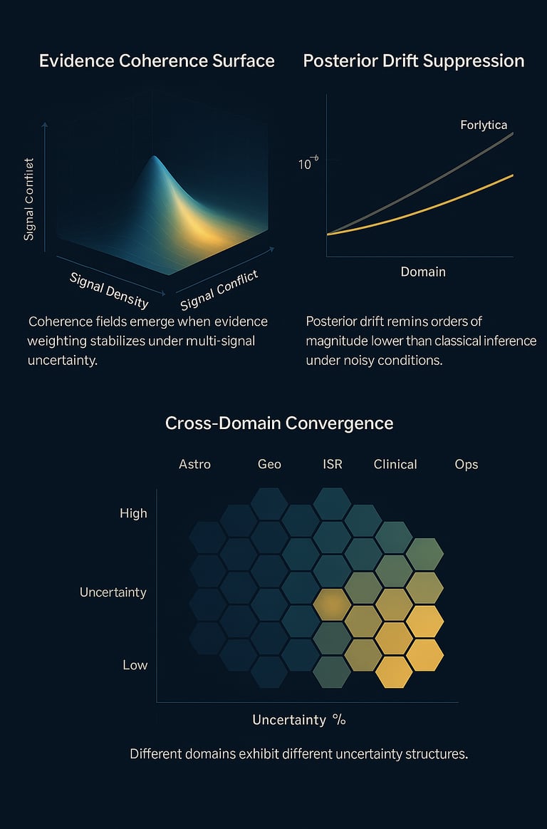 Despite this diversity, Forlytica research identifies common convergence behaviors: evidence fields from disparate domains often align into similar coherence structures when stabilized through disciplined Bayesian weighting. The “Cross-Domain Convergence” visualization demonstrates this effect: uncertainty structures differ, but convergence patterns emerge across astro, geo, ISR, clinical, and operational environments. This is the scientific backbone of Forlytica’s ability to generalize across domains without exposing internal architecture.